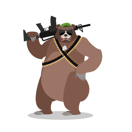 ライフルと軍事のクマ 銃を持つグリズリー 野生の獣および機関銃テープ 動物の兵士 軍スタイル 兵士のバッジとヘルメット のイラスト素材 ベクタ Image